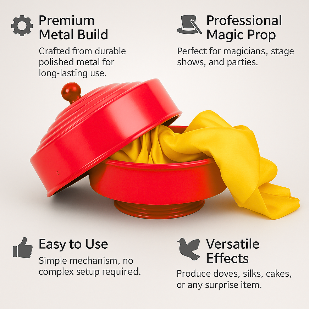 The Dove Pan (RED Metal) is a timeless stage magic device. Show the pan empty, drop in a piece of lit paper, cover it — and when you open the lid… a live dove, candy, or even a small cake appears!