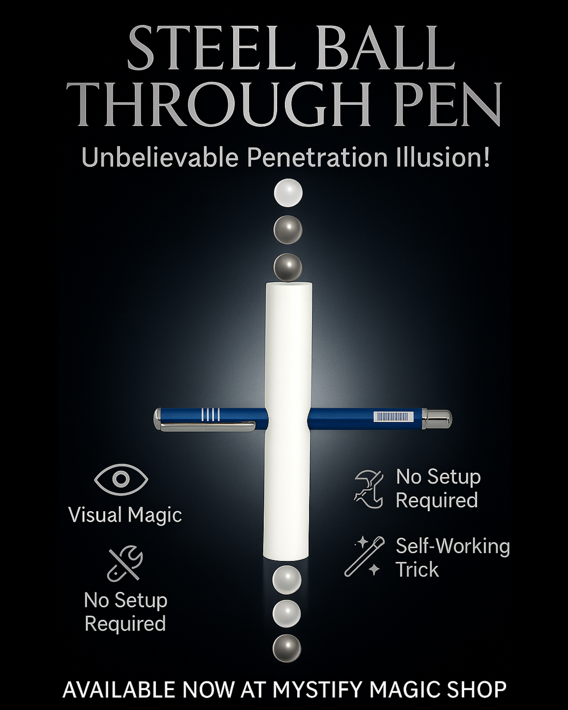 The performer pushes a pen through a hole in a short plastic tube, creating a cross shape. Then, a solid steel ball is dropped into the tube — but stops where the pen is blocking it.